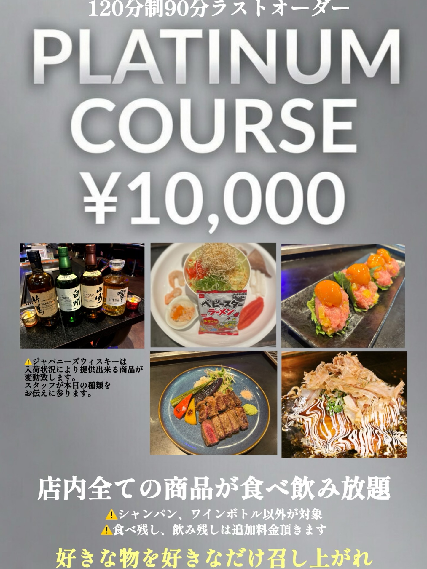 この度、プラチナコースを始めさせて頂きます✨✨ お客様のこんなコースがあったら良いを形にさせて頂きました🙋🙋🙋 ジャパニーズウィスキーをはじめ店内全て食べ飲み放題となっております📣📣📣 本当とんでもないです。期間限定になるかも知れません。 是非お早目にご利用くださいませ⚠️⚠️⚠️